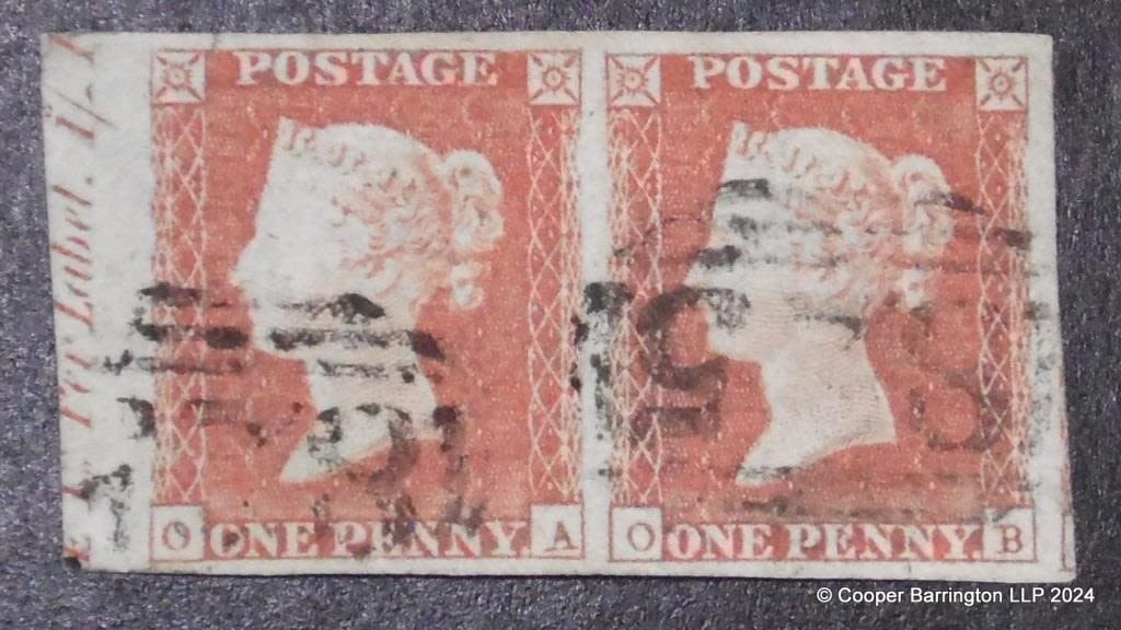 Great Britain 1841 1d Red Brown Imperf Pair OA-OB. 4 Margin with Marginal Inscription ‘1d Per Label. 1/- P’. Cancelled with 1844 (825) Black London Numeral Postmark.