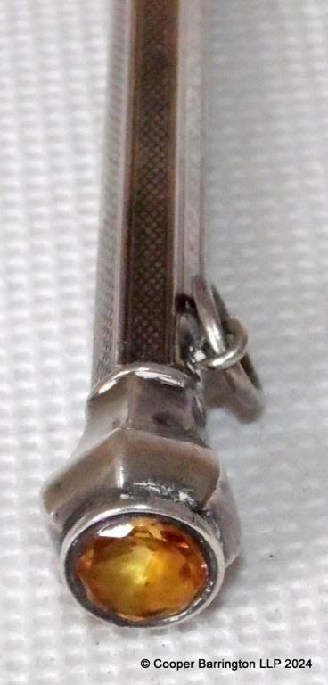 Victorian S Mordan & Co. Makers & Patentees Silver Sliding Propelling Pencil. 19th Century. Having engine turned body and slider ring and finial which is set with a yellow citrine seal stone and unscrews to reveal a lead reservoir.