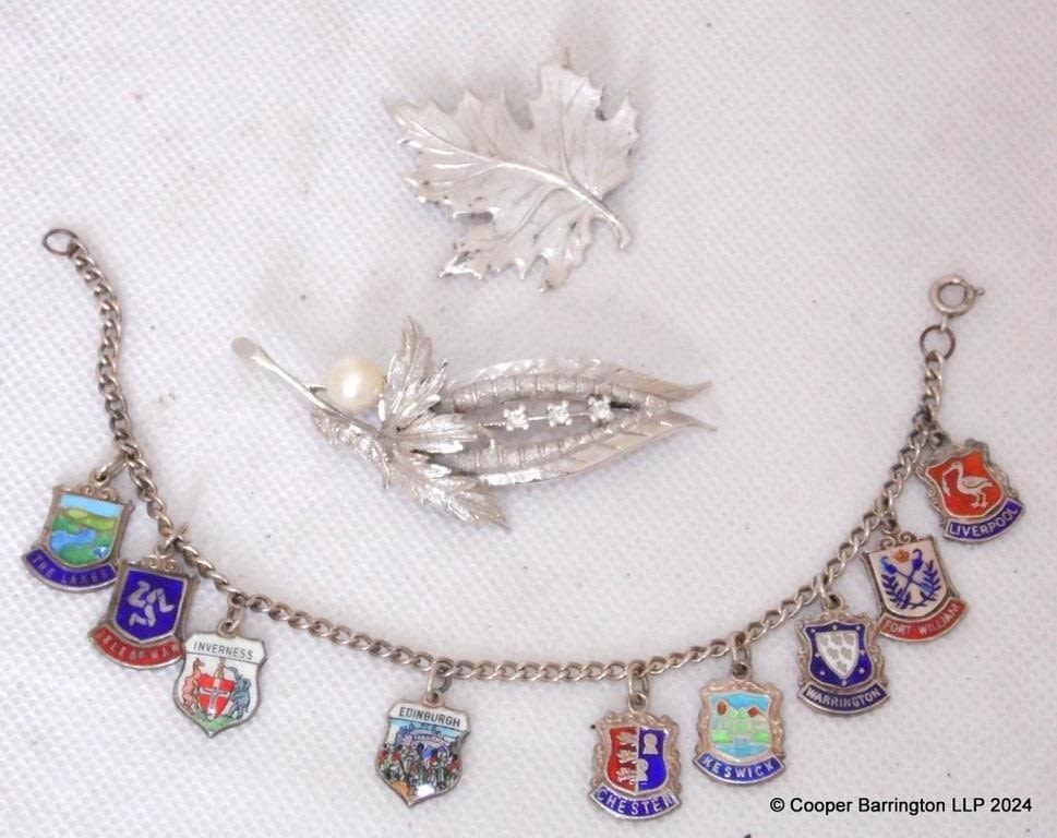 Vintage Sterling Silver and Enamel Travel Shield Bracelet with Nine Shields. 15.4 gm. Also two silver metal brooches. (3 Items)