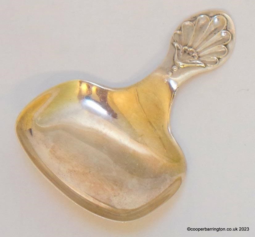 KGV Sterling Silver Caddy Spoon with Shell Detail to the Handle by Cooper Brothers & Sons Ltd. Hallmarked Sheffield 1935.