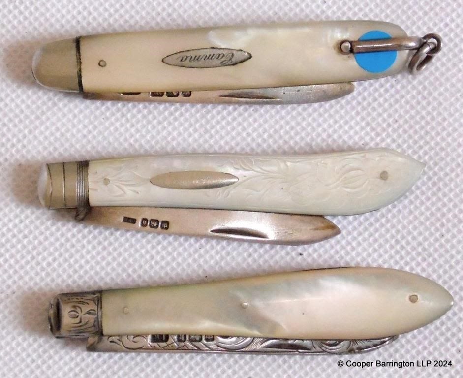 Victorian & Edwardian Sterling Silver and Mother of Pearl Fruit Knives by C.W.Fletcher & Son.Joseph Rogers & Sons.James Fenton. Hallmarked Sheffield 1900/02/04. (3 Items)