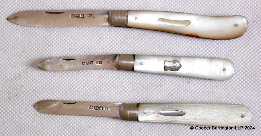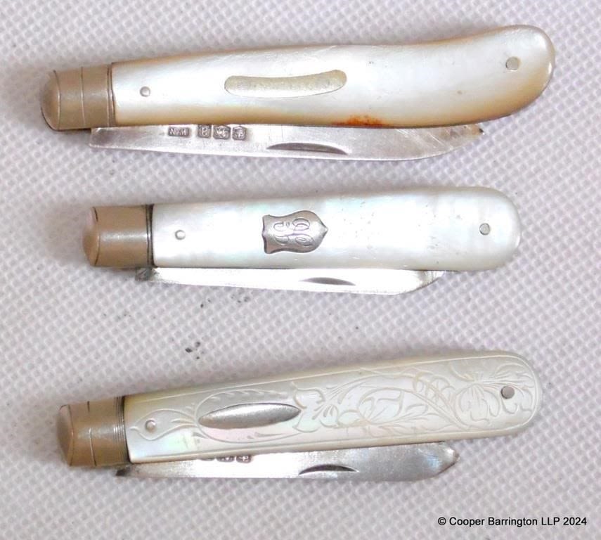 KGV Sterling Silver and Mother of Pearl Fruit Knives by William Needham. Hallmarked Sheffield 1918/21/25 (3 Items)