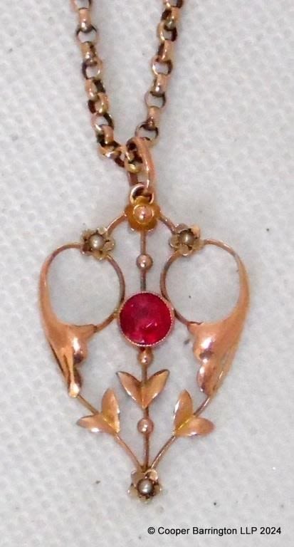 Edwardian 9ct Yellow Gold Ruby and Seed Pearl Pendant on 17 inch Belcher Chain. Marked 9ct. 5.7 gm gross.