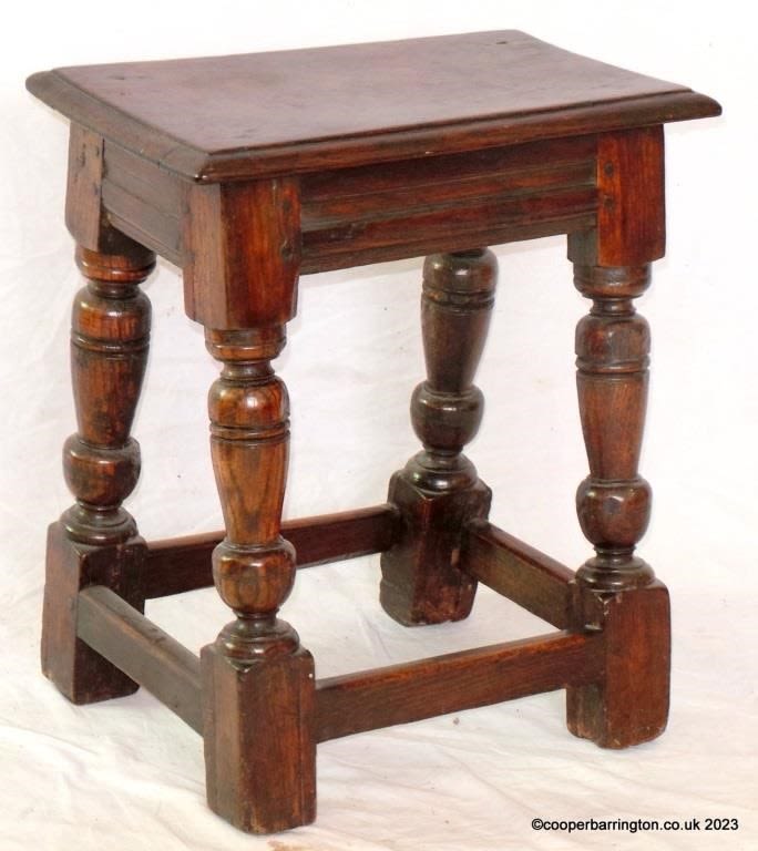 George lll Oak Peg Joint Stool. Circa 1750. The solid molded top supported on well turned legs linked by cross-stretchers. Height 21 in Width 18 in Depth 11.5 in.