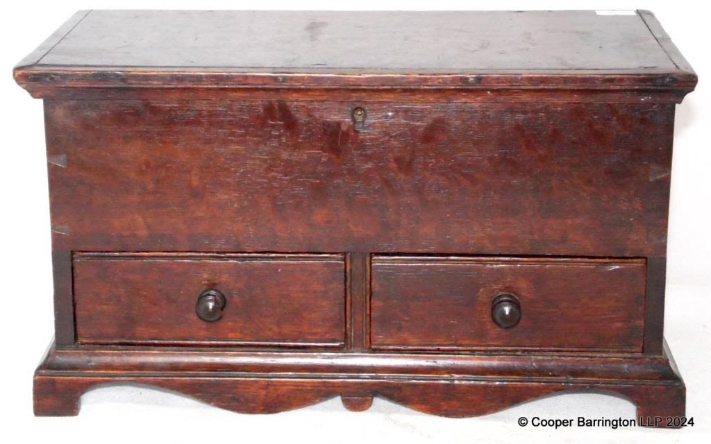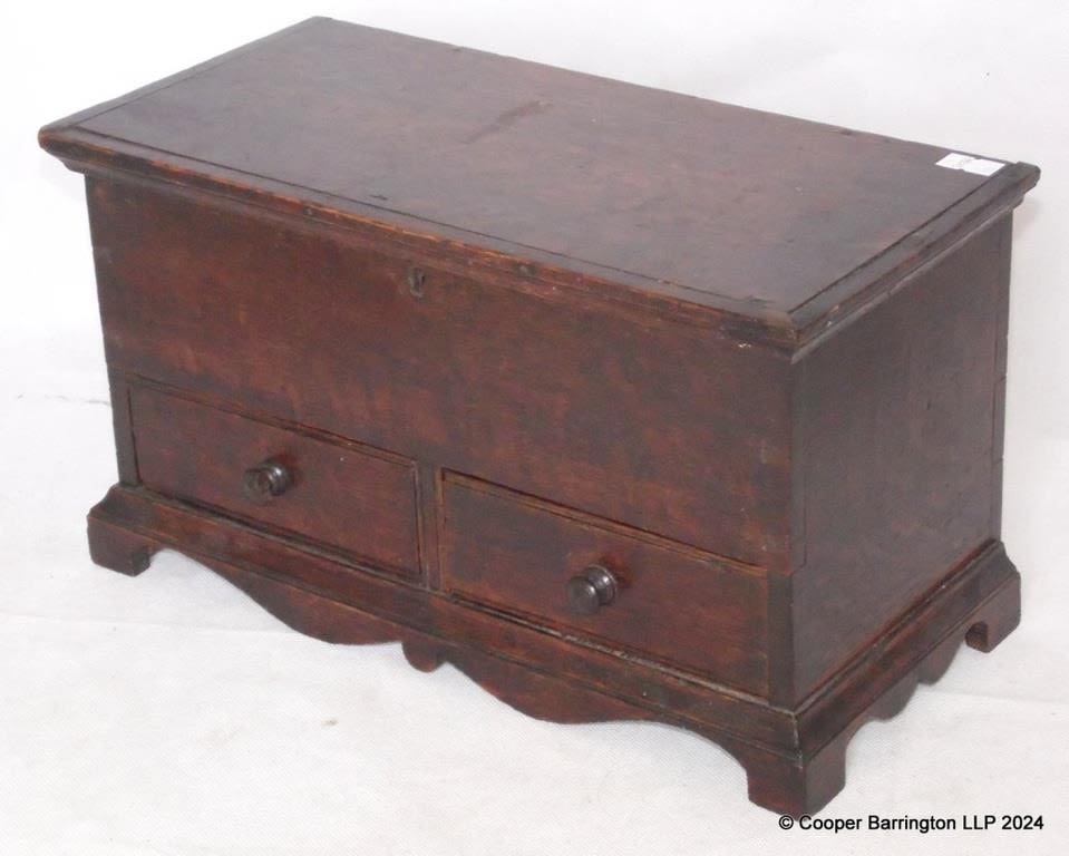 Antique Apprentice Mule Chest.English,Oak,Miniature Coffer,Desktop. Late 18th/Early 19th Century. The upper compartment with hinged lid over two drawers raised on a shaped plinth base. Width 34 cm. Height 19 cm. Depth 16.5 cm.