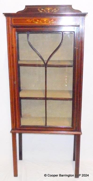 Edwardian Mahogany Inlaid Display Cabinet. Early 1900s. The inlaid upstand back and freeze over a single glazed door enclosing two shelves all raised on square legs. Height 57.5 in. Width 24 in. Depth 11.75 in.