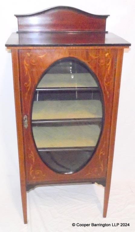 Edwardian Inlaid Mahogany Music Cabinet. Early 1900s. The shaped upstand back over a single oval glazed door inlaid to each corner opening to reveal three shelves all raised on slender tapered legs. Height 45.5 in. Width 21.5 in. Depth 14 in.