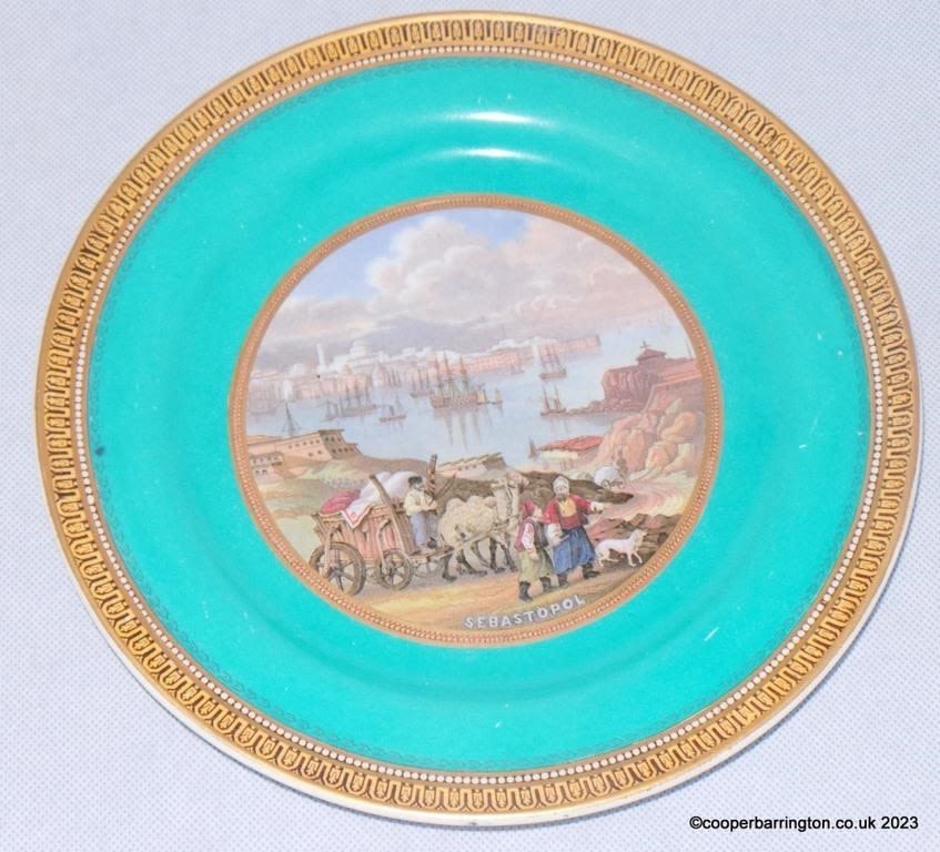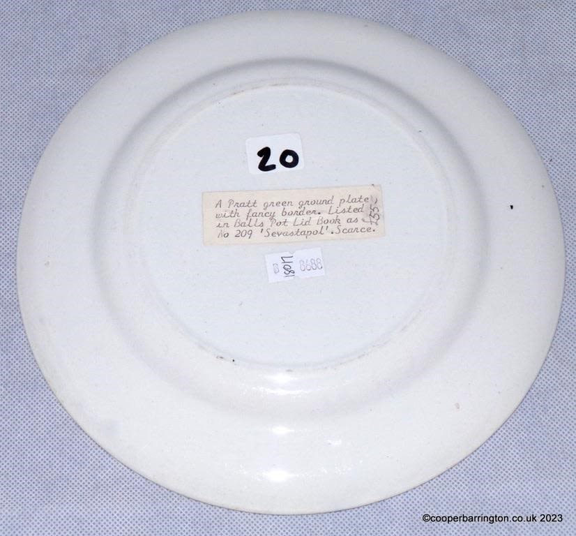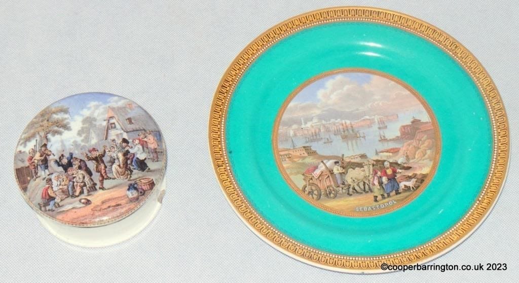 Victorian Prattware ‘Sebastopol’ Plate with Green Border. Circa 1860s. Also a Prattware Pot Lid/Base ‘The Village Wedding’. (2 Items)