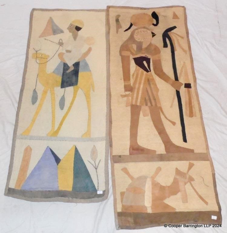 Two Art Deco Egyptian Theme Cotton Embroidered Vertical Wall Hangings. 113 x 44 cm. and 102 x 43 cm (2 Items)