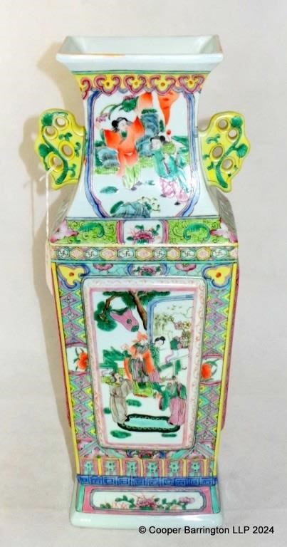 Large Chinese Porcelain Polychrome Painted Square Vase.Mid 20th Century. Height 43 cm.