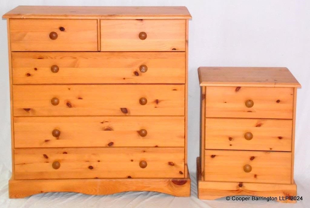 Vintage Pine Two over Four Chest of Drawers. Height 36 in. Width 35 in. Depth 15 in. Also a matching pine bedside cabinet of three drawers. Height 23.5 in. Width 18.5 in Depth 14.5 in. (2 items)