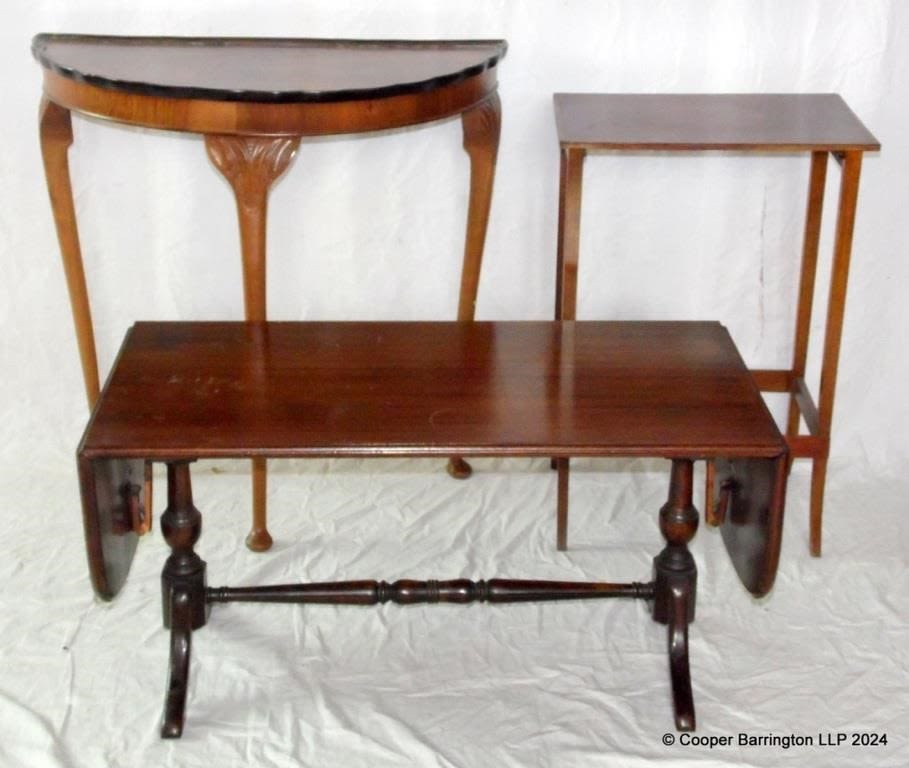 Vintage Mahogany Drop Leaf Coffee Table. A Walnut Hall Half Moon Console Side Demi Lune Side Table and a Lamp Table. (3 items)