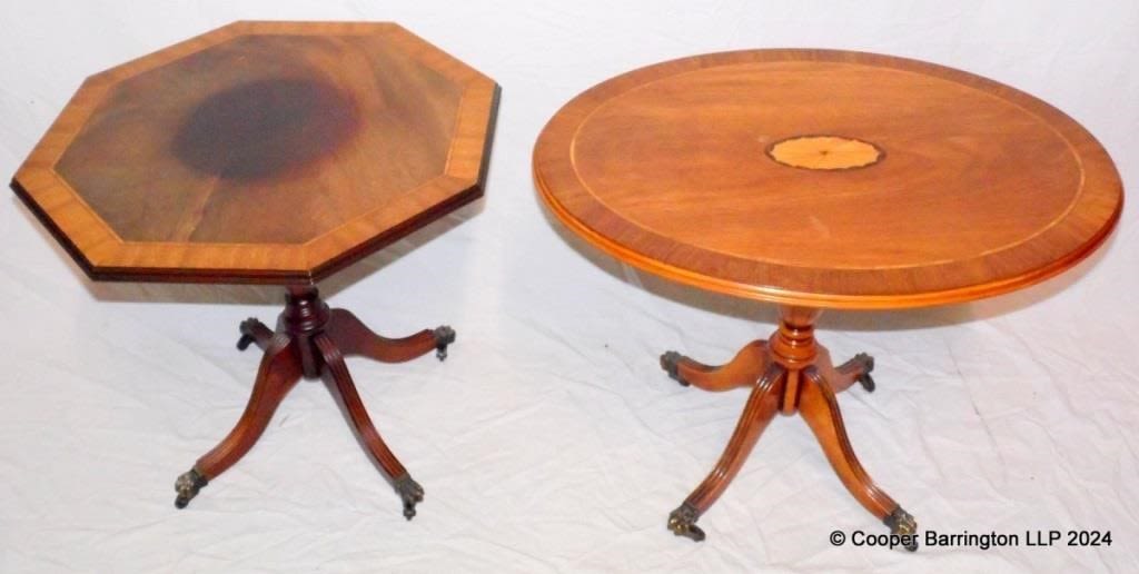 20th Century Oval Inlaid Regency Style Coffee Table. The oval top with fan inlay and crossbanding raised on a single column with four reeded legs with brass casters. Height 21 in. Top 20 x 27 inches. Also one other with octagonal top. Diameter 24 inches. (2 Items)