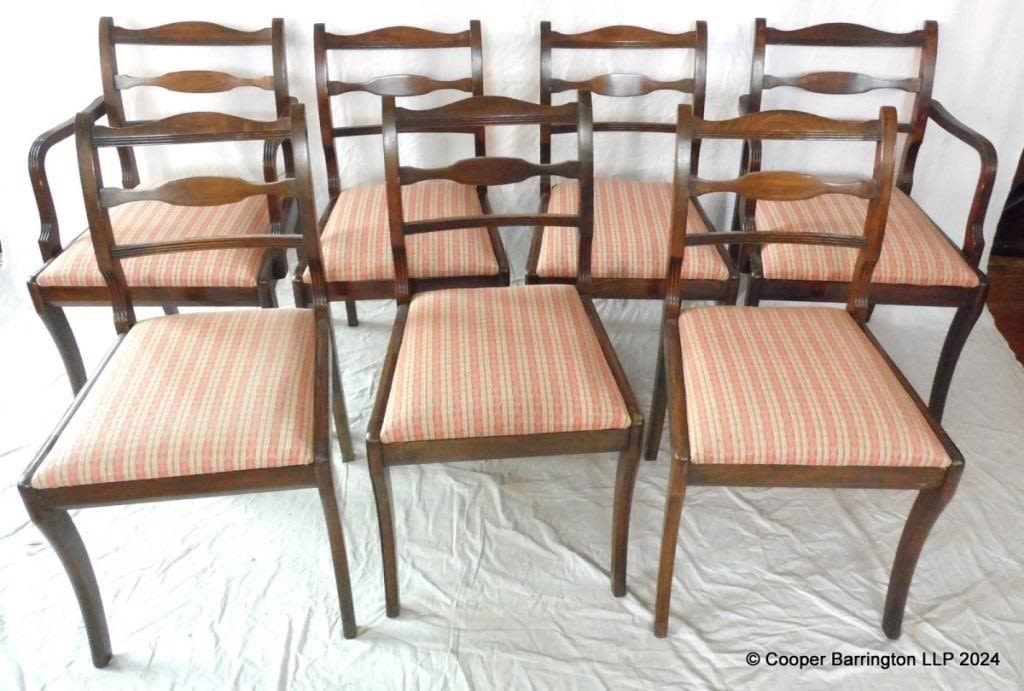 Edwardian Oak Oval Wind Out Dining Table to Seat up to Eight People with a set of Seven Regency Style Dining Chairs.(Five chairs plus 2 carvers). Table Height 28.75 in., Width 41 in, Length extendable from 58 to 82 inches. (8 Items)