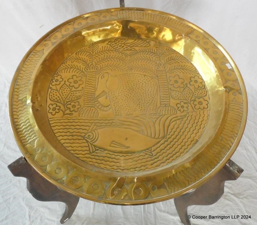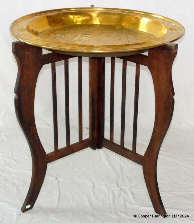 Antique Large Indian Brass Top Tray Table on Folding Base. Early 1900s. Decorated with animal scenes,palm trees and foliate. Diameter 72 cm. Height 75.5 cm.