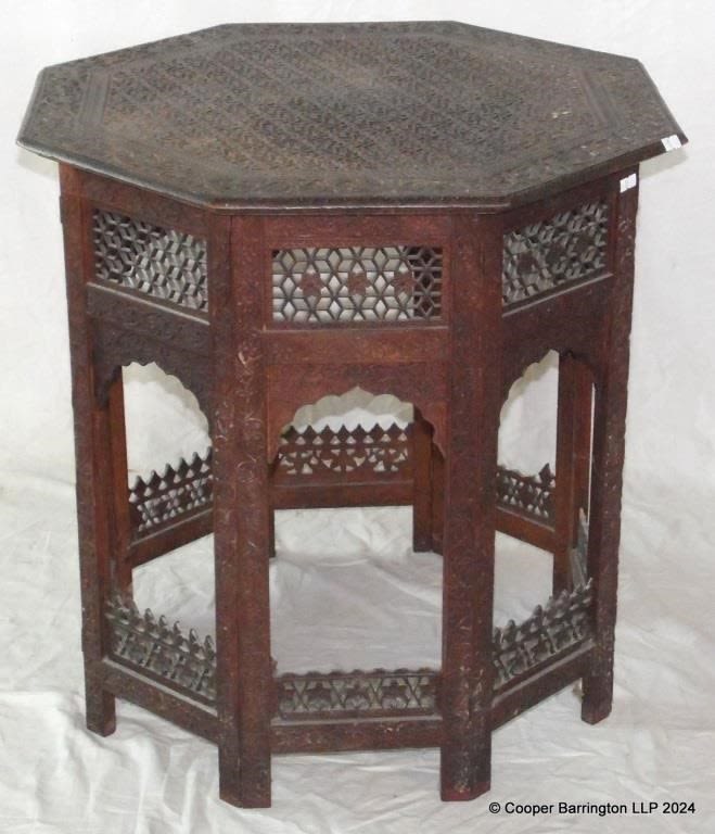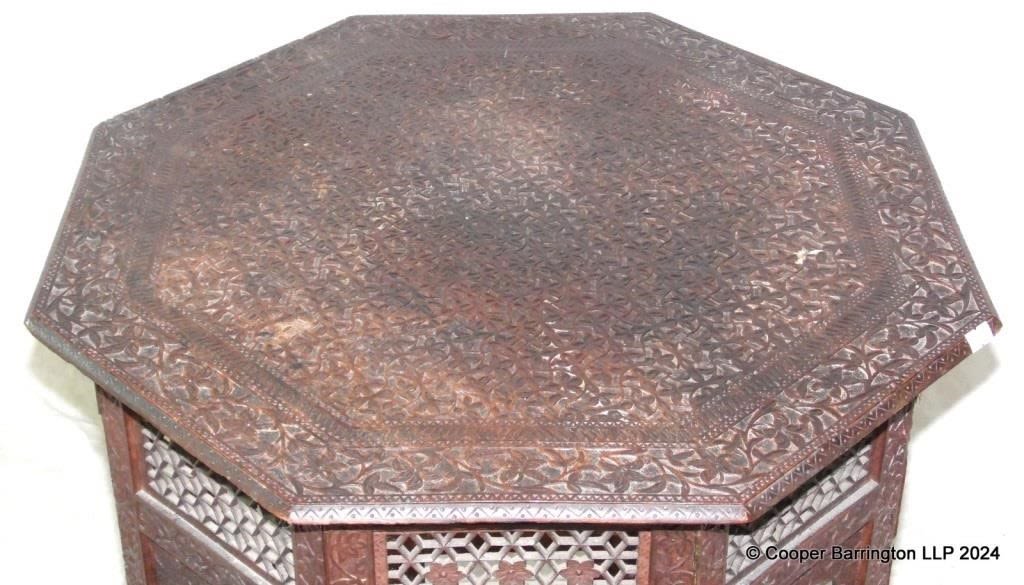 Antique Carved Hardwood Indian Octagonal Table on Folding Base. Early 1900s. Diameter 66 cm. Height 63 cm.