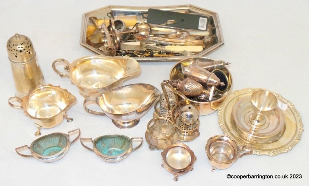 Collection of Antique/Vintage Silver Plated Items to Include: Milk/Cream Jugs x 2. Gravy Boat. Sugar Sifter. Salts x 5. Quantity of Flatware Etc. (50 + Items)