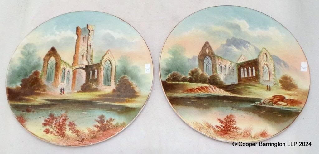 A Pair of Staffordshire Hand Painted Wall Plaques of Abbeys. Early 1900s. Diameter 33 cm. (2 Items)