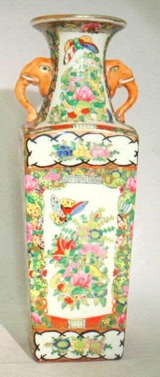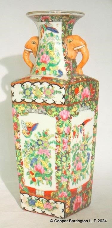 A Large Chinese Famille Rose Square Porcelain Polychrome Painted Vase. Early 20th Century. The flaired neck with elephant masks and tapered square body,folate decorated with butterflies and birds. Apocryphal Qianlong mark to base. Height 36.5 cm