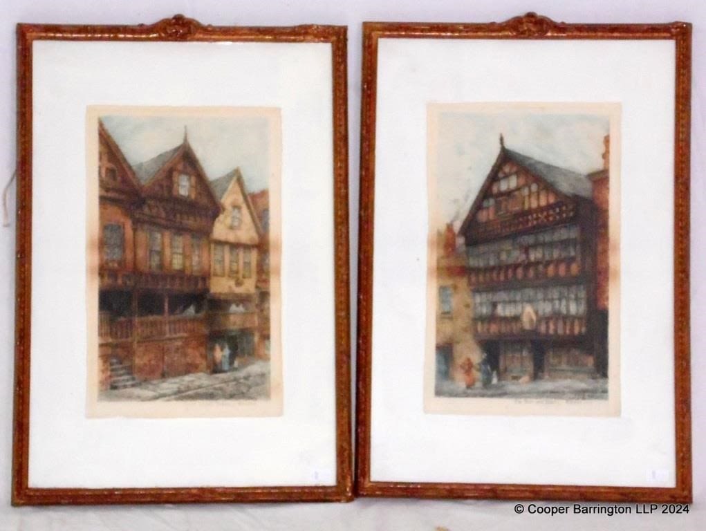 A Pair of William Monk RE (1863-1937) English Colored Engravings Titled “Bishop Lloyd’s ”Palace”, Chester” and ” The Bear and Billet Chester 1892. Late 19th Century. Framed under glass 35 x 51.5 cm. (2 items)