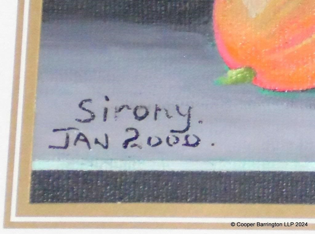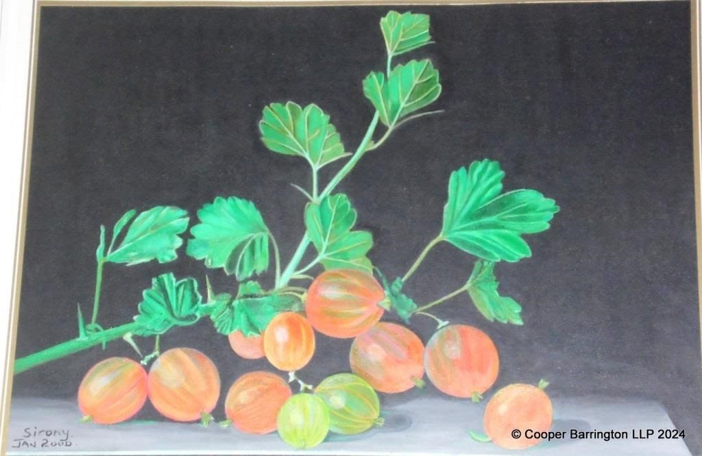Signed Sironi Acrylic Still Life Gooseberries on Board. Signed and dated Sironi Jan 2000 lower left. Gilt framed 50 x 60 cm.