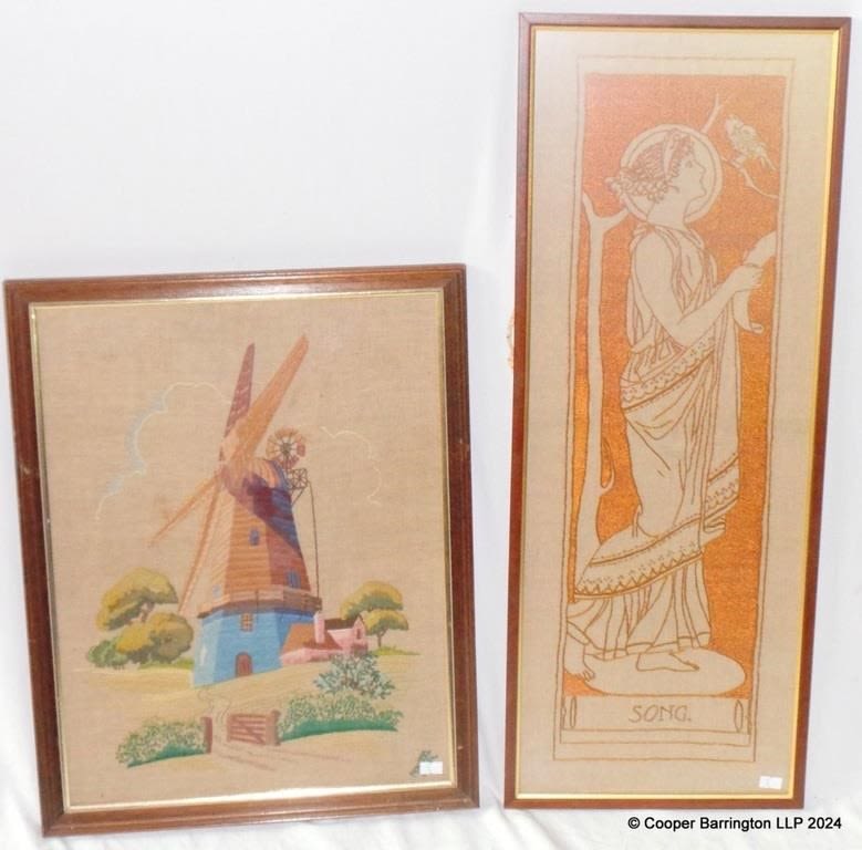 Arts & Crafts Embroidered Panel ‘Song’. Late 19th Century. Framed under glass 78.5 x 30 cm. Plus one other ‘Windmill’ Signed J.Mc.N. Nov.1950. 55 x 43 cm. (2 Items)